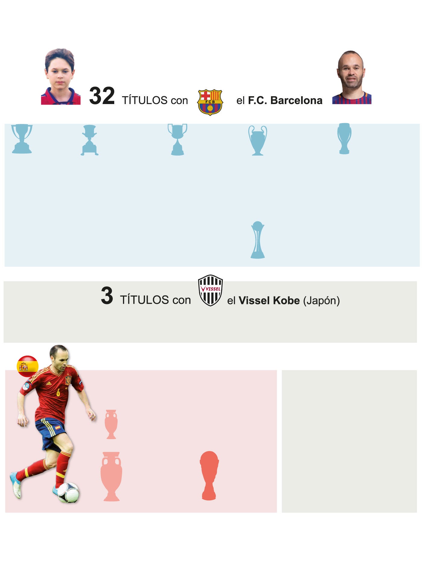 Iniesta también ha sido un icono en el Barcelona, el club de su vida y al que llegó siendo un niño. Siempre recuerda las duras noches en la Masía, fuera de casa, en las que encontró cobijo junto a Víctor Valdés, íntimo amigo y compañero de éxitos en el Barcelona más talentoso de todos los tiempos. Vestido de azulgrana ganó cuatro Champions League, nueve Ligas, seis Copas del Rey y dos Mundiales de Club, entre otros muchos títulos. Además, estuvo entre los tres finalistas al Balón de Oro en 2010 junto a Messi y Xavi Hernández, galardón que finalmente se llevó el argentino.