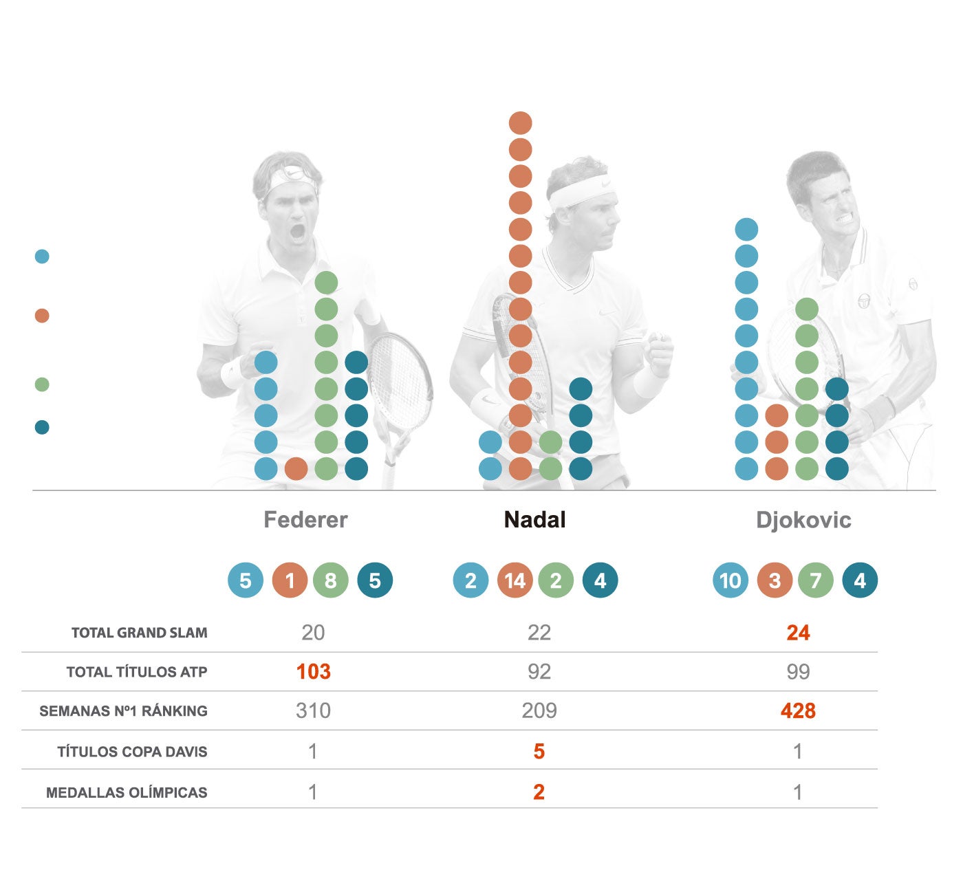 El suizo era la elegancia; el español, la bravura. Una mezcla perfecta que confluyó en cuarenta duelos a cada cual más intenso, más emotivo, más exigente, más personal. «Esto me está matando», diría Federer sobre la tortura que le supuso el juego de Nadal. Se persiguieron en la excelencia hasta firmar tablas emocionales tras veinte años caminando juntos de final en final. Djokovic añadió el mordiente que necesitaba para seguir creciendo. Un reto que lo elevó todavía más, y aunque es el serbio quien firma todos los récords, no serían tanto el uno sin los otros.