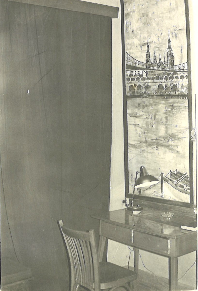 Un sencilla mesa de madera y un robusto sillón de madera nos sirvió de mesa de trabajo, Un mural con la Imagen de la Virgen del Pilar y Una gran foto del Templo del Pilar acabaron por decorar la habitación y añadimos un sencillo mueble que seirvió de inicio de nuestra incipiente biblioteca.