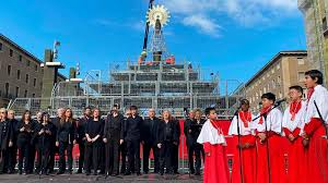 Con los pelos de punta mientras el coro entonaba el himno a la Virgen del Pilar, la imagen de la Virgen ya se podía vislumbrar en lo alto de una estructura de 15,5 metros de altura, que ha requerido de 30 horas de montaje y que puede soportar más de 40 toneladas de peso. En pocas horas, comenzará a llenarse con flores de todo tipo, entre las que destacarán los claveles blancos, protagonistas este año.