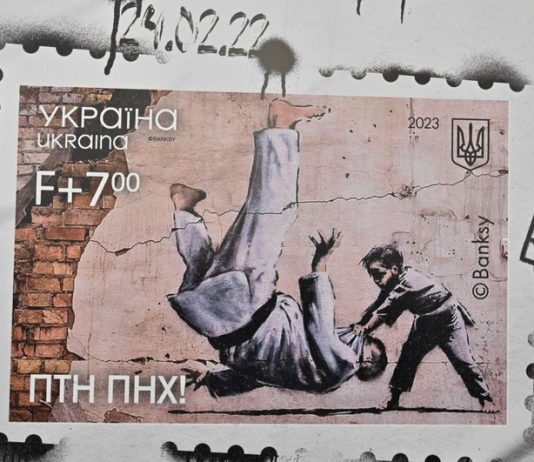 Ucrania estrena el sello del mural de Banksy en el que un niño hace una llave de judo a Putin